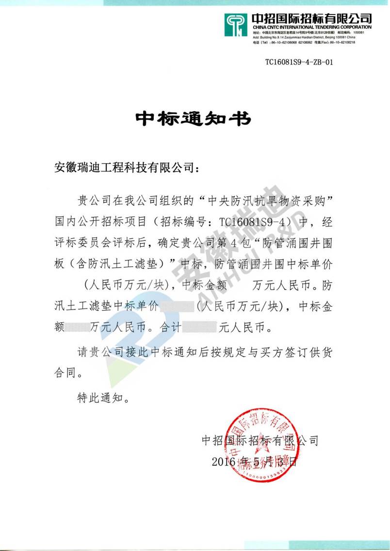 我公司憑借過硬的產(chǎn)品品質(zhì)、完善的技術(shù)方案及合理的產(chǎn)品報(bào)價(jià)在競爭對手中脫穎而出,順利中標(biāo)中央防汛抗旱物資采購項(xiàng)目(招標(biāo)編號(hào):TC16081S9-4)第四包“防管涌圍井圍板(含防汛土工濾墊)”中標(biāo)。