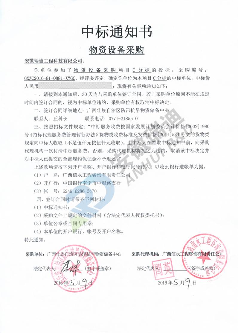 我公司憑借過硬的產(chǎn)品品質(zhì)、完善的技術(shù)方案及合理的產(chǎn)品報(bào)價(jià)在競爭對手中脫穎而出,順利中標(biāo)廣西壯族自治區(qū)防汛抗旱物資儲(chǔ)備中心(簡稱“招標(biāo)人”或“甲方”)物資采購項(xiàng)目(采購編號:GXZC2016-G1-0881-XYGCC分標(biāo)。