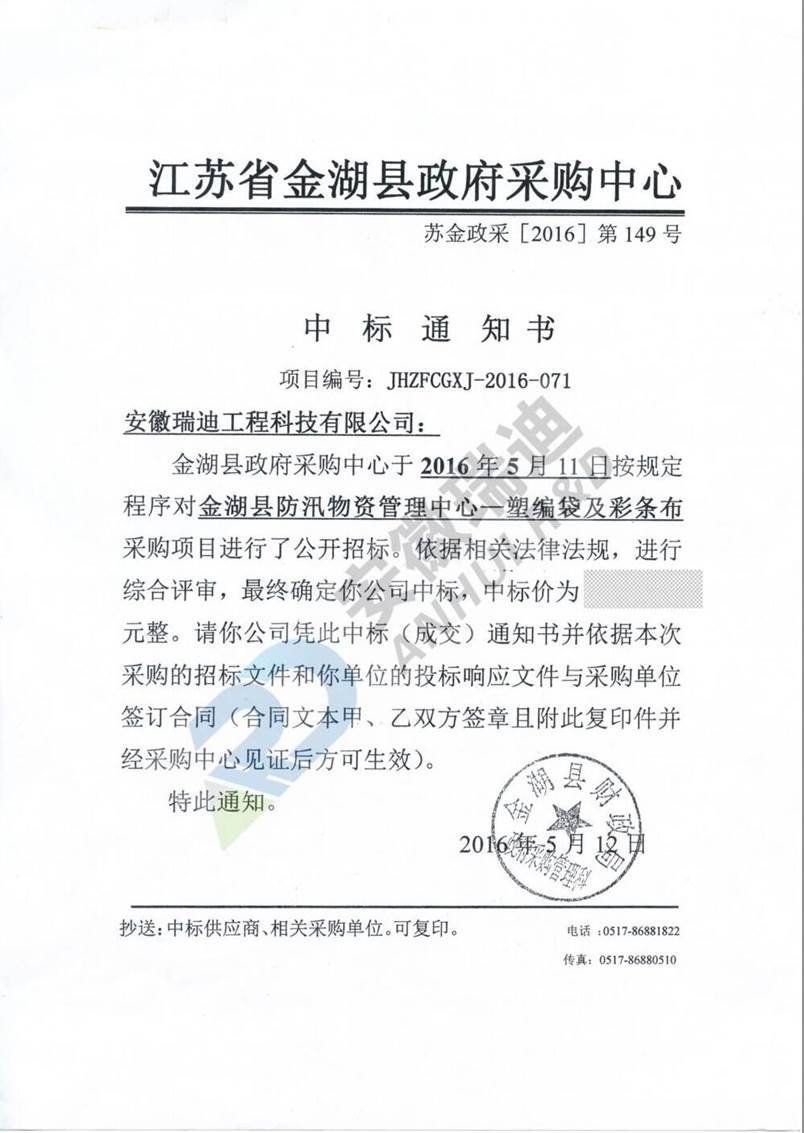 我公司憑借過硬的產(chǎn)品品質(zhì)、完善的技術(shù)方案及合理的產(chǎn)品報價在競爭對手中脫穎而出,順利中標(biāo)金湖縣防汛物資管理中心塑編袋及彩條布采購項目(采購編號:JHZFCGXJ-2016-071)。