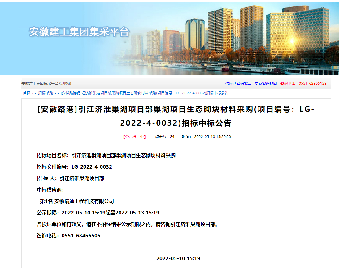 中標(biāo)項(xiàng)目一:引江濟(jì)淮巢湖項(xiàng)目部生態(tài)砌塊材料采購(gòu)