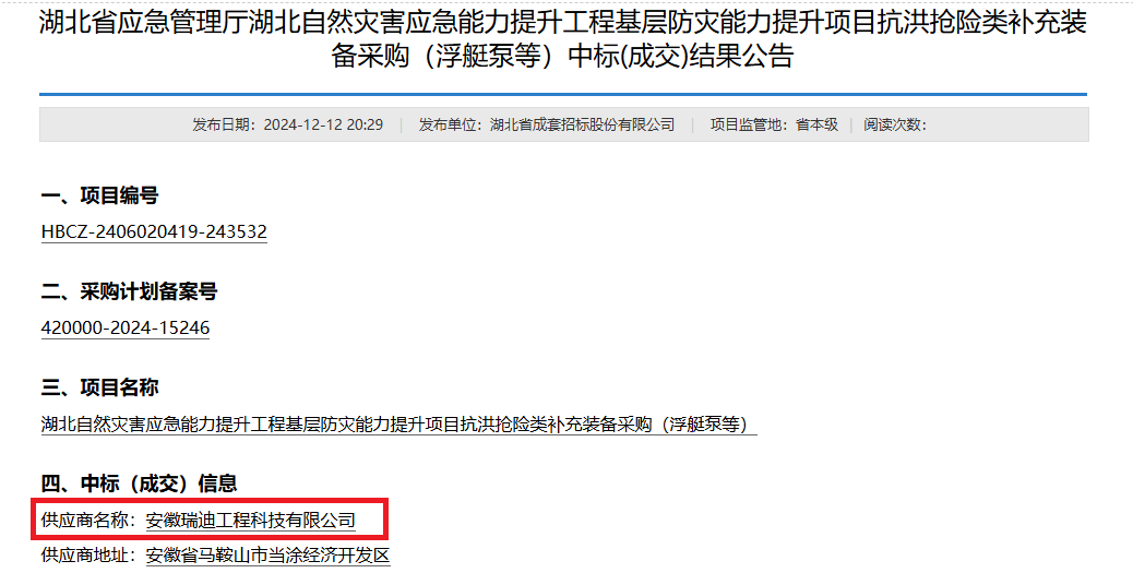 熱烈祝賀我司在湖北省應急管理廳湖北自然災害應急能力提升工程基層防災能力提升項目抗洪搶險類補充裝備采購(浮艇泵等)招標中脫穎而出,成功中標!中標金額為 4896.227萬元,這是公司發(fā)展歷程中的又一重要里程碑!