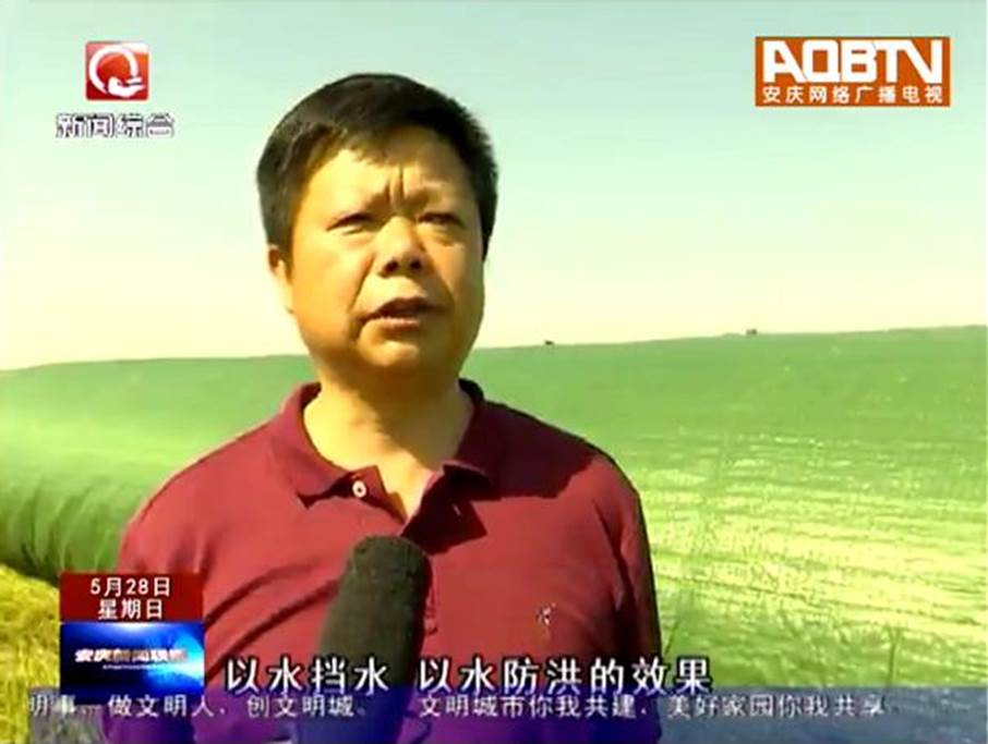 安慶市水利局綜合減災(zāi)科科長朱承忠同期聲:在我們這次演練當(dāng)中,已經(jīng)展示了“超長防汛管袋”的以水擋水,以水防洪的效果,具有建筑時間短,構(gòu)筑子堤快,防汛效果好的作用。
