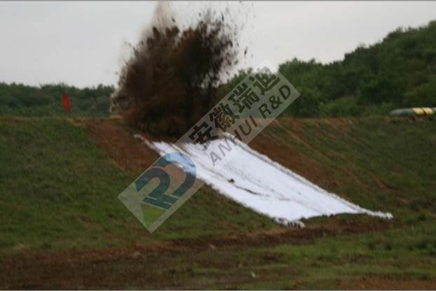 汛期,洪水漫溢險情時有發(fā)生,緊急險情下,要建立臨時溢洪道主動泄洪,降低潰壩風(fēng)險。泄洪防護(hù)墊專門用于防止臨時泄洪時背水坡泄洪段的沖刷破壞,其結(jié)構(gòu)分為三層,外層為高強(qiáng)防護(hù)布,中間層為特殊結(jié)構(gòu)網(wǎng)狀體,底層為高摩擦抗滑防滲體。寬幅最大6.0m,單體長度30米。具有搶險速度快、連接方便、抗滑穩(wěn)定性好和能重復(fù)利用等優(yōu)點(diǎn)。
